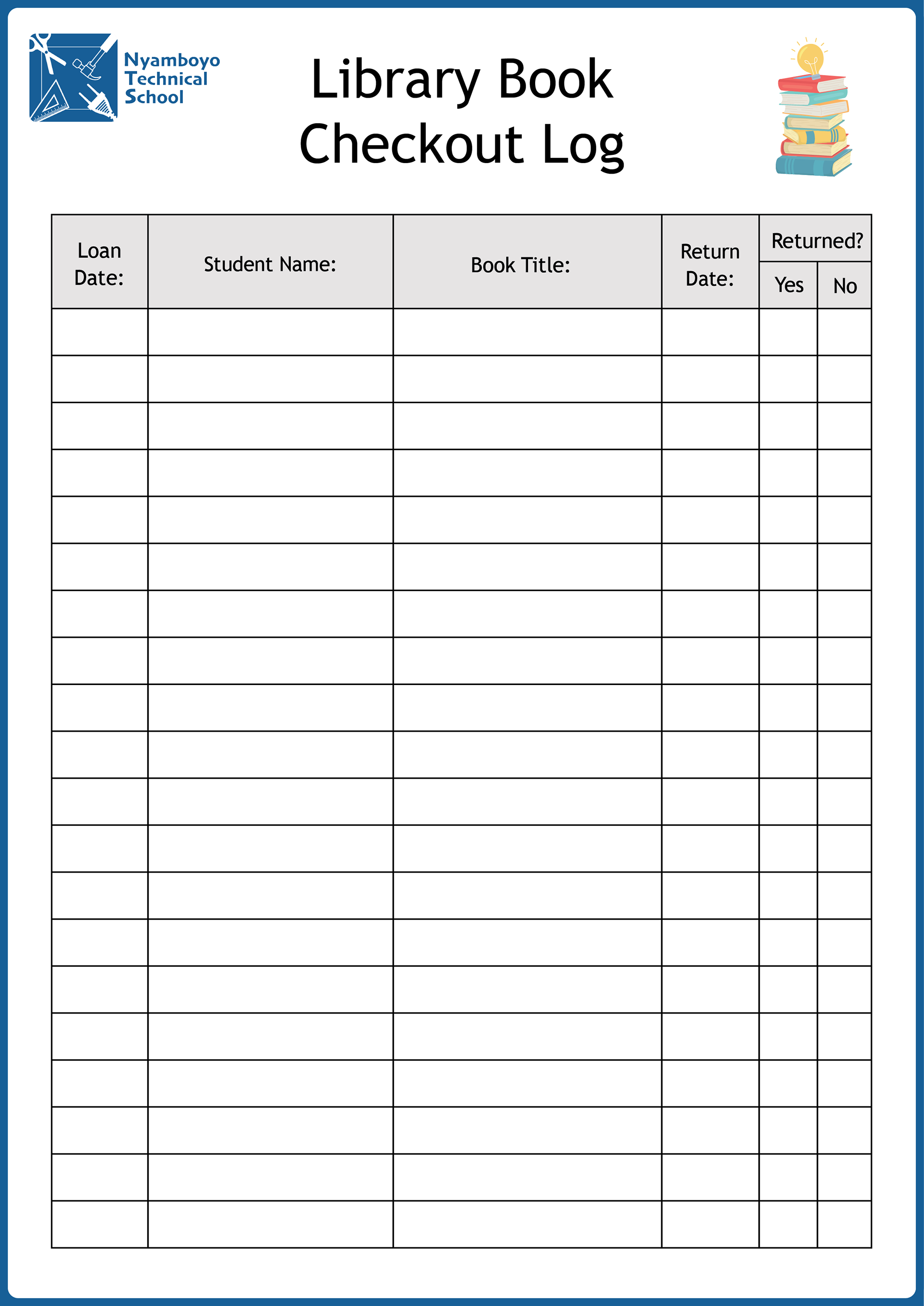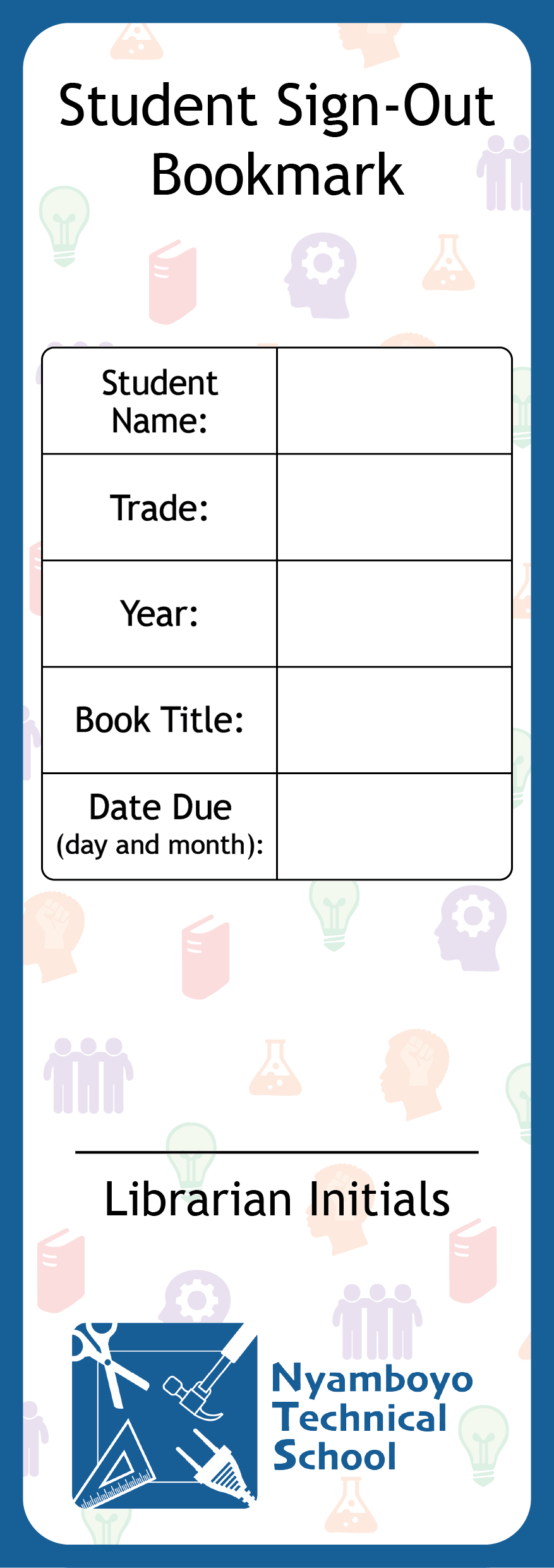 NTS a not-for-profit 3-year vocational school located in the Nyamboyo Village in southwestern Kenya. As a volunteer in October 2025, I was tasked with designing a bookmark that has due dates for books and a log that keeps track of book sign outs for their new library.